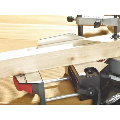 Die Metabo Kapp- und Gehrungssäge KGS 216 M besitzt eine Zugfunktion für breite Werkstücke und eignet sich ideal zum Sägen von Holz, beschichteten Paneelen und Kunststoffen. Ergonomisch erfüllt sie mit einer rutschfesten Gummierung an Hand- und oberem Tragegriff sowie seitlichen Tragegriffen alle Wünsche. Eine Transportsicherung und eine Kabelaufwicklung sind ebenfalls vorhanden. Die Tischverbreiterung ist auf beiden Seiten stufenlos ausziehbar und mit einer praktischen Auflagefläche sowie einem integrierten Ablänganschlag ausgestattet. Das Arbeiten mit der Metabo Kapp- und Gehrungssäge KGS 216 M wird Ihnen zudem durch integriertes Arbeitslicht, eine Schnitttiefenregulierung und eine Sägeblattarretierung zum einfachen Sägeblattwechsel vereinfacht. Ein Laser dient zur exakten Anzeige des Schnittes und der Spänefangsack sorgt für saubere Luft am Arbeitsplatz.